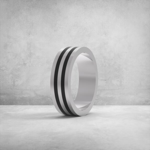 Стильна сучасна обручка з акцентом на мінімалістичній геометрії: дві чорні смужки емалі створюють елегантний контраст із металом. Сувора симетрія та графічність роблять модель універсальною — підходить як чоловікам, так і жінкам. Такий дизайн виглядає дорого, акуратно та дуже сучасно.