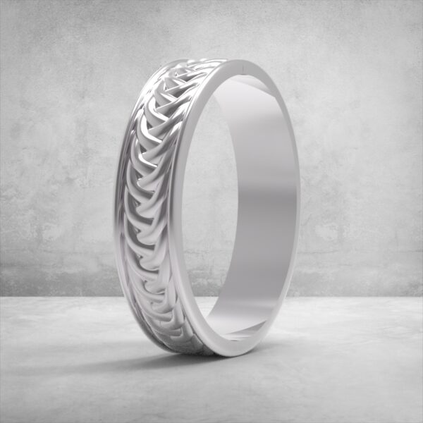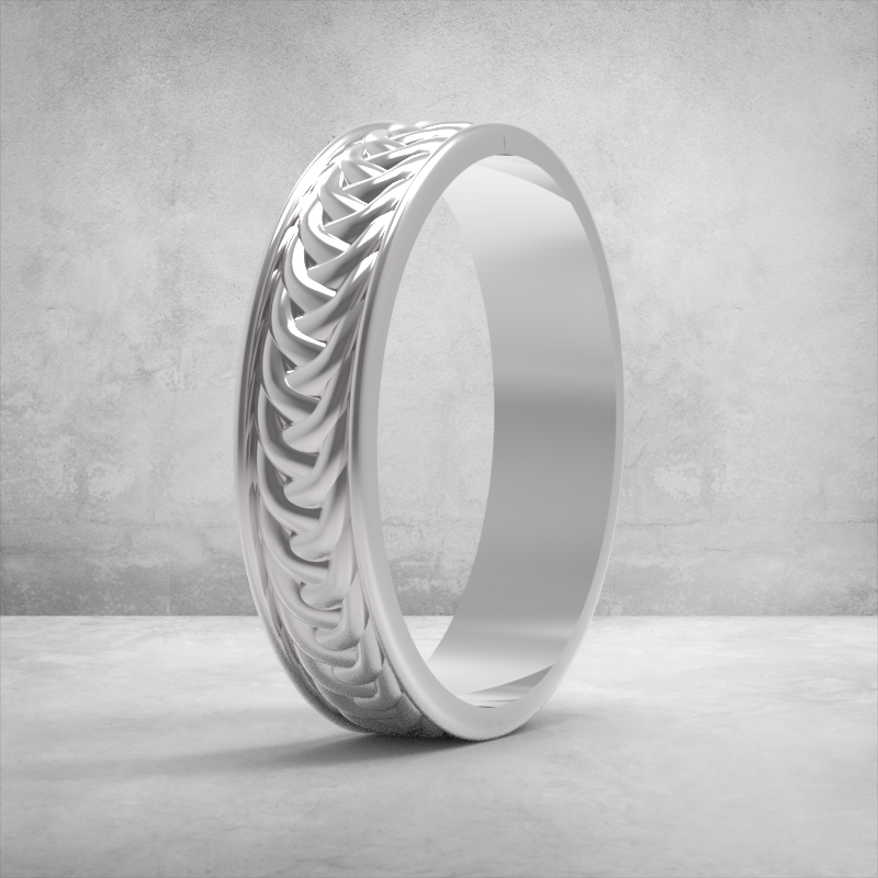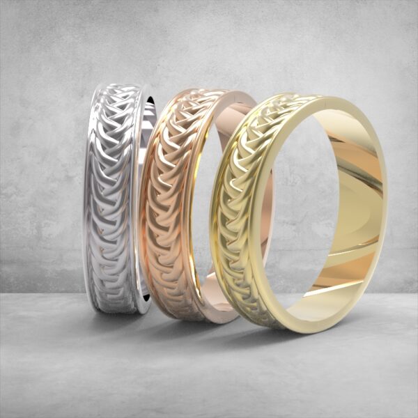 Обручка з унікальним візерунком, що нагадує переплетення київських орнаментів та стародавніх прикрас. Об’ємна текстура створює ефект ручного плетіння, надаючи моделі глибини та характеру. Така обручка підкреслює українську самобутність, поєднуючи традицію та сучасність у вишуканому ювелірному виконанні.