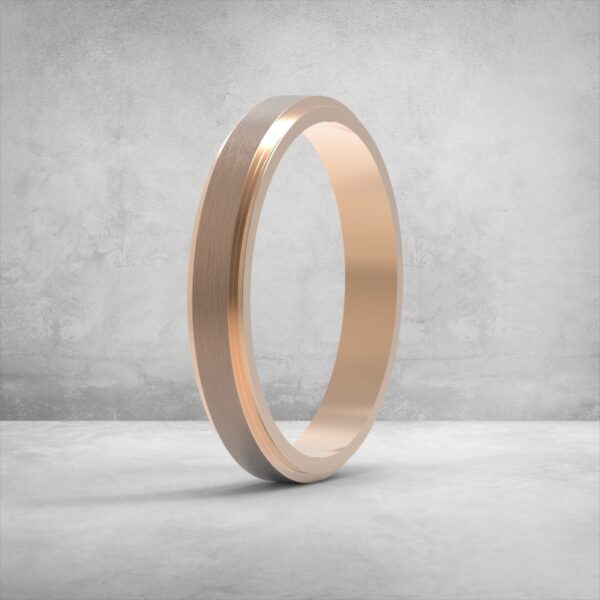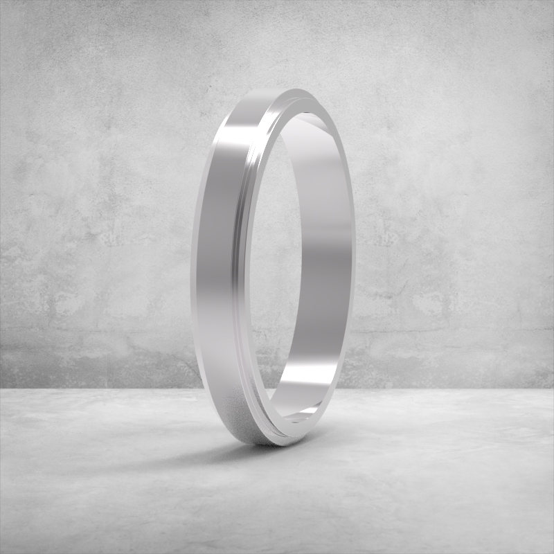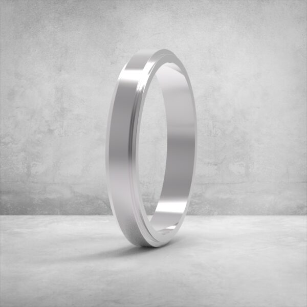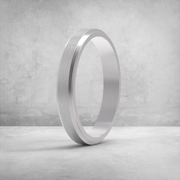 Стильна мінімалістична обручка з витонченим контрастом фактур: матова центральна частина поєднується з вузькою полірованою фаскою. Лаконічна форма та стримана естетика роблять цей дизайн універсальним — ідеальним для прихильників чистих, сучасних ліній. Обручка виглядає легкою, акуратною та дорогою в будь-якому металі.